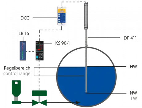 Uygulama ve fonksiyon LW ve HW sinyalizasyonu ile sürekli su seviyesi kontrolü Su seviye vericisi DCC Çıkışı: 4-20mA PS = 32 bar / 464 psi, DP411 + DCC + KS90 ile isteğe bağlı: LED uzaktan gösterge LB 16