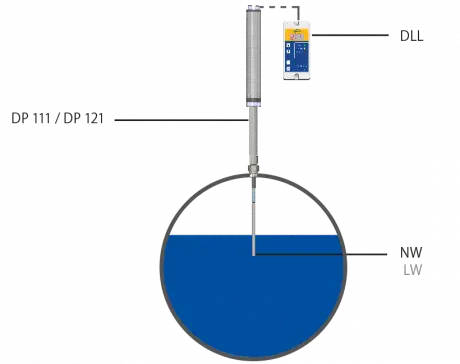 Uygulama ve fonksiyon Denetimsiz çalıştırma ve/veya daha yüksek risk potansiyeli için Kısa aralıklarla otomatik kendi kendine testler Bileşen tanımlama işareti ve SIL3 sertifikalı LW sınırlaması: PS = 32 bar / 464 psi, DP111 + DLL ile PS = 200 bar / 2901 psi, DP121 + DLL ile Bir DLL, gerekli her iki düşük su sınırlama probunu da değerlendirebilir